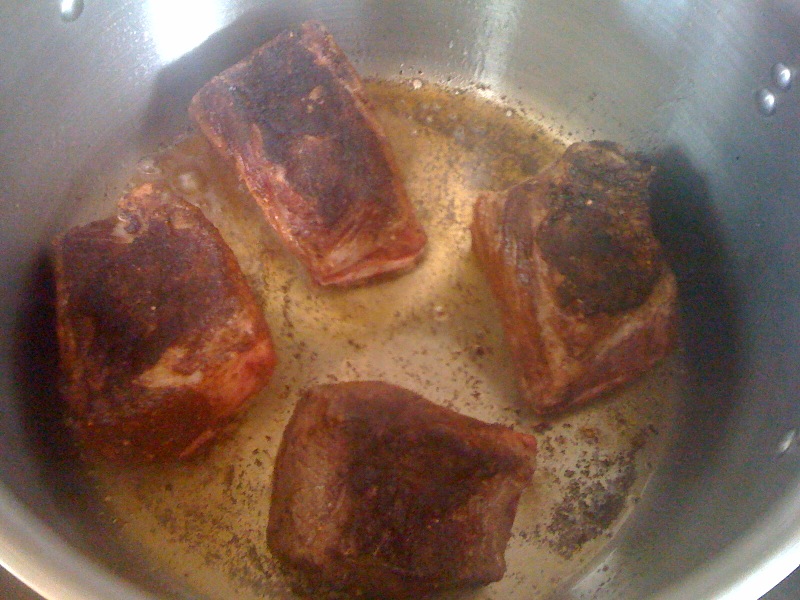 After a long day at the office, I headed home to begin cooking. It was at this point that I wondered to myself why I thought it would be a good idea to try braising short ribs knowing that the earliest I would be getting home is 6, and at a minimum it would take 3 hours to get the ribs to a nice and tender state (unless I had a pressure cooker of course...). But, since I had already proceeded to apply the salt and pepper, I needed to make sure I cooked them. So, I just dove in and decided that I would simply find myself a snack at some point in the evening. Besides, after eating out for the past few nights, I needed a change and a home-cooked meal, even if my Urbanspoon ranking might suffer a little.