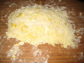 When I cut the dough to begin to run through the pasta maker, it completely fell apart. I looked at the recipe and it said it was supposed to be flaky and crumbly, so I tried to run it through the pasta machine. It didn't work so well, as it just fell apart as it went through. I went back to the recipe and it said I could add a little water. I sprinkled some on, and tried again, but it still fell apart. So I put on some more, and got a little overzealous. The top was almost soupy, and the bottom dry. I mixed it together the best I could and started running it through, but now it was too hard. The whole thing was just a mess. That piece was totally scrapped, and I pulled out the second. I again added some water, and ran it through the pasta machine at it's widest setting and it started to work! I narrowed the setting, and ran it through again, slowly thinning out the dough. It was still an adventure as I had trouble getting it to do in straight, or I would drop one end and it would tear. I ended up working that piece of dough through the machine at least a dozen times. But, I finally wound up with a sheet of pasta that seemed to be the consistency and thickness I was looking for.